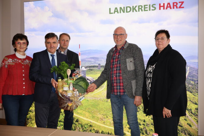 Der Bauernverband Nordharz e.V. hat an Landrat Thomas Balcerowski zum Ende der Erntezeit den traditionellen Erntekorb mit Lebensmitteln aus der Region überreicht. Dieser sei auch ein Zeichen der engen Verbundenheit des Landkreises Harz mit der Landwirtschaft, erklärte Geschäftsführerin Diana Borchert. Beim gemeinsamen Gespräch zogen Uwe Thielecke und Karsten Zein vom Vorstand sowie die Vizepräsidentin Bauernverbandes Sachsen-Anhalt e.V. Susann Thielecke eine gemischte Bilanz für das Landwirtschaftsjahr 2025. Landrat Balcerowski dankte den Landwirten für ihre Arbeit. Diese sei unerlässlich für die Versorgung der Bevölkerung.