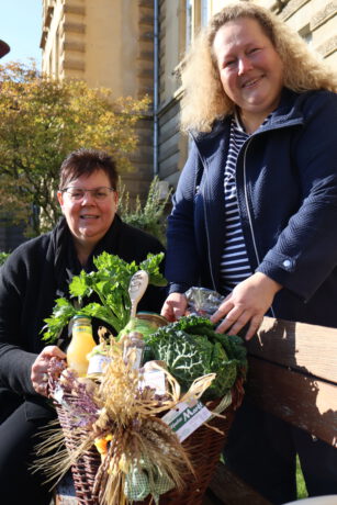 Über den Erntekorb freute sich Cathleen Brand von der Caritas. Die Regionalstellenleiterin in Halberstadt nahm ihn aus den Händen von Diana Borchert in Empfang. Die frischen Zutaten werden in der angeschlossenen Küche zu einer herzhaften Mahlzeit verarbeitet und an die Gäste der Wärmestube ausgeben.